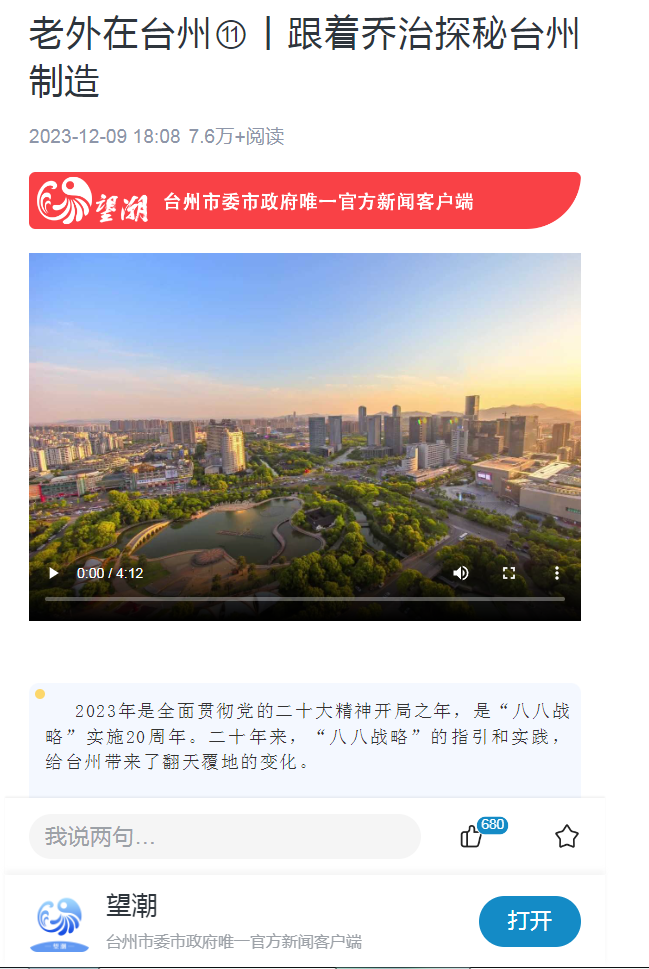 2023年是全面贯彻党的二十大精神开局之年,是“八八战略”实施20周年。二十年来,“八八战略”的指引和实践,给台州带来了翻天覆地的变化。为生动展现“八八战略”实施20年来台州经济社会发展取得的巨大成果,台州市委宣传部与市人民政府外事办公室联合策划,继续推出《老外在台州》融媒体系列作品,从在台外国人的视角,讲述台州故事。——发布于2023年12月9日《望潮》客户端https://tzapp.taizhou.com.cn/webDetails/vide...