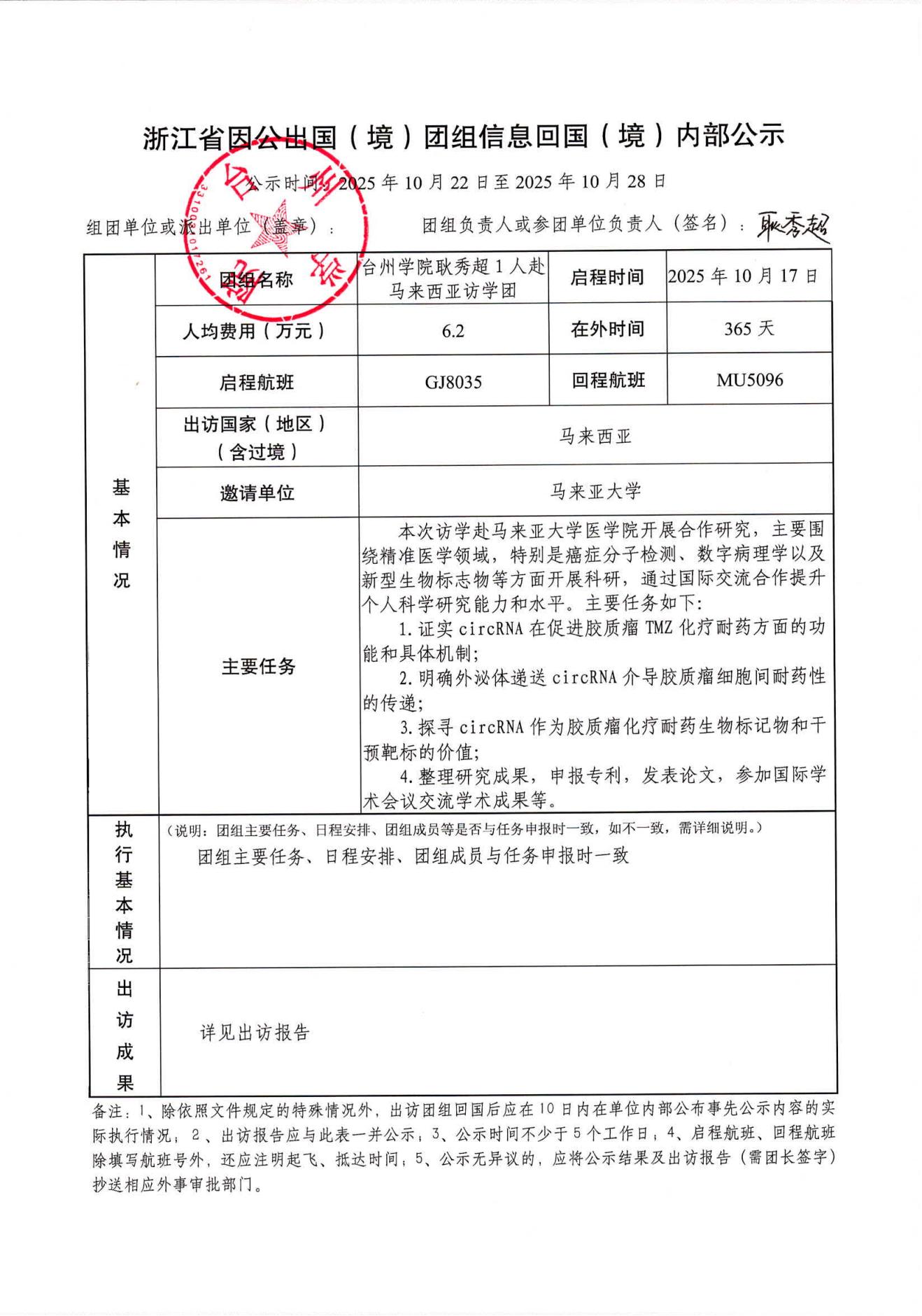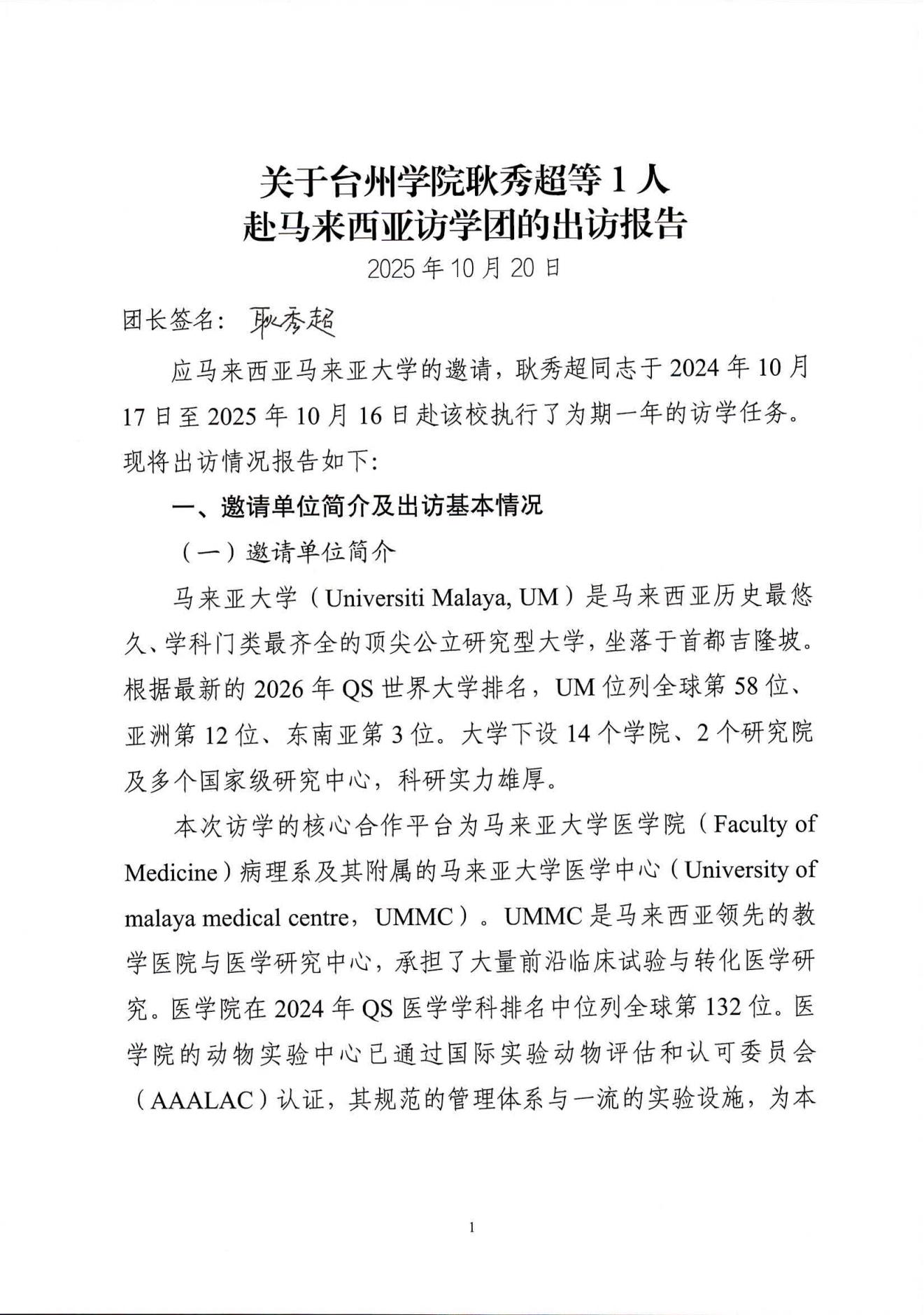 耿秀超1人赴马来西亚访学回国(境)公示