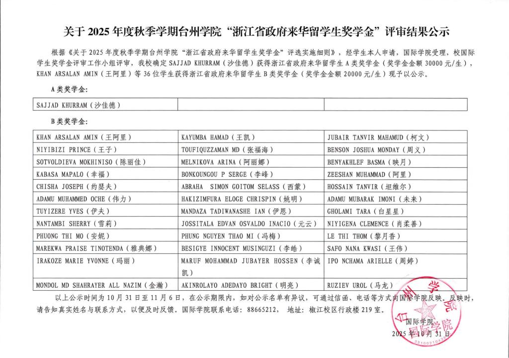 关于2025年度秋季学期台州学院“浙江省政府来华留学生奖学金”评审结果公示