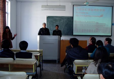 消防安全,防患于未然。目前在我校的外教与留学生有29人,分别来自美国、澳大利亚、越南、韩国、德国和伊朗六个国家,为提高外籍师生的紧急避险、自救自护和应变的能力,校保卫处会同国际交流处邀请临海市消防大队陶荣富队长来校,为外籍师生作消防安全专题讲座,并进行消防演练。