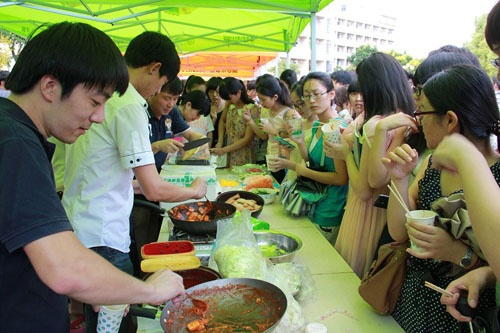 中韩两国都有中秋节这一传统佳节,此次活动正值中秋前夕,这也成为两国同学共同庆祝中秋的聚会,许多中国同学都主动帮忙,一起参与美食的制作。活动现场弥漫着韩国大酱浓郁的香味,耳畔萦绕着锅碗瓢盆清脆的碰撞声和韩语汉语的亲切欢快的交谈声。不多时,一盘盘秀色可餐的佳肴被制作出来,色香味俱全,令人垂涎欲滴,吸引了500多位中国师生来现场品尝。