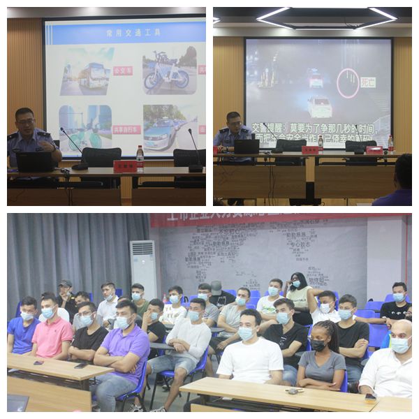 台州公安平安宣讲团讲师、台州市公共安全教育馆民警林鹏为外籍师生带来交通安全教育。利用生动有趣的图片向外籍师生介绍中国交通指示标志;从学生日常出行实际出发,强调行人安全与非机动车驾驶注意事项等。通过播放交通事故视频,更加直观地向师生展现了常见的交通安全隐患以及不良交通习惯所导致的严重后果,为全体师生打好预防针,注入清醒剂。