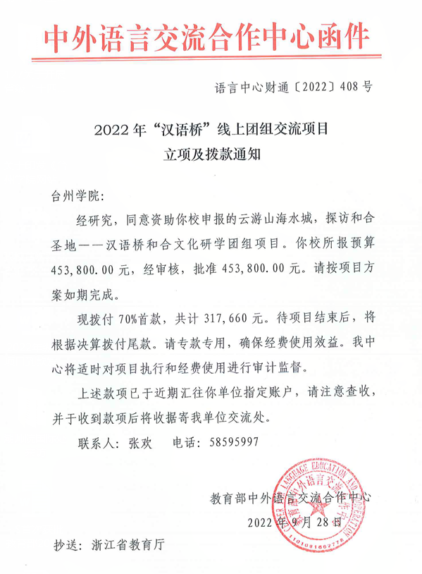 近日,教育部中外语言交流合作中心公布了2022年“汉语桥”线上团组交流项目评审结果,我校人文学院金妮娅副教授申报的“云游山海水城,探访和合圣地一一汉语桥和合文化研学团组项目”成功获批立项。这是我校首次获批该类项目。