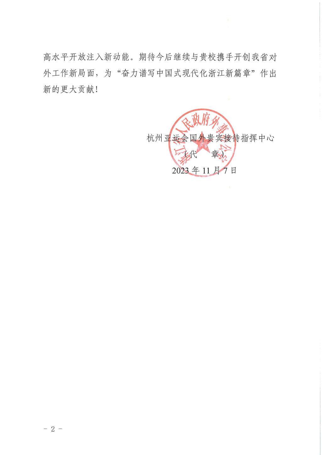 近日,杭州亚运会国外贵宾接待指挥中心致信我校,感谢我校深入贯彻落实中央和省委、省政府决策部署,服务大局、周密组织、科学调度,抽调骨干力量支持杭州第19届亚运会和第4届亚残运会工作。