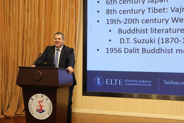 当天上午,Hamar Imre(郝清新)应邀在国际会议厅给近200位师生作《佛教对儒家家庭观念的解读:孝道为普世慈悲》讲座。副校长、党委委员李建军主持讲座。