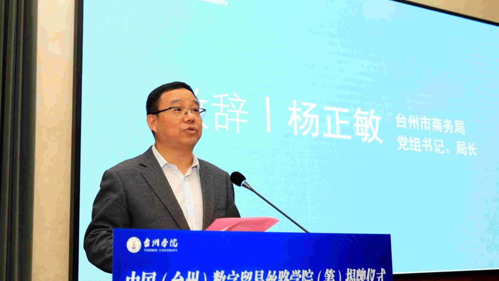 杨正敏代表台州市商务局,向中国(台州)数字贸易丝路学院(筹)的成功创建表示诚挚祝贺,他指出,台州作为全国开放发展前沿城市之一,是国内国际双循环的“枢纽节点”。中国(台州)数字贸易丝路学院(筹)的成立,既是聚焦省“一号开放工程”战略部署和台州数字经济、数字贸易发展需要的务实举措,也是新形势下开展校企合作的先行探索,更是贯彻落实“一带一路”倡议、助力共建“一带一路”国家人才培养平台的共赢之举。他表示,台州市商务局将继续全力支持台州学院打造有特色、高水平、有分量的数字贸易产学研平台,推动学院成为今后我市数字贸易领域技能人才和数字化运营团队的智力支持高地和人才培养高地,更好地服务“一带一路”建设,助力台州打造高能级开放强市。