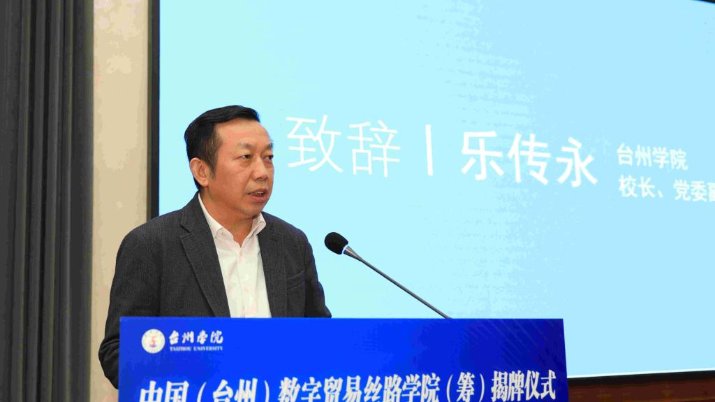 乐传永代表学校热烈欢迎参会领导与代表,并衷心感谢长期以来关心支持学校事业发展的社会各界朋友。他说,为深入贯彻落实“地瓜经济”提能升级“一号开放工程”,台州市启动“海外台州”建设行动,为进一步加强浙江教育对外开放高地建设,浙江省推动“丝路学院”高质量发展,助力提升浙江企业“走出去”水平,不断擦亮具有鲜明浙江特色的境外办学品牌。我校携手政府、企业与国家智库,共同建设中国(台州)数字贸易丝路学院(筹),是积极响应“一带一路”倡议,投身“丝路学院”建设的有力举措,是助力“海外台州”建设的大胆尝试。他强调,希望市政府和相关单位一如既往关心支持家门口大学建设,将更多优质办学资源引入我校,共同推动学校事业实现更高质量发展;希望学校各相关部门紧扣时代脉搏,充分利用数字贸易领域专业优势与人才智力优势,紧密联系台州企业,聚焦产业与企业需求,深化产教融合,不断提高服务台州经济发展能力;希望台州企业与我校开展良性互动,精准对接,同频共振,充分发挥海内外市场优势,围绕“产业链”打造“人才链”,不断发展“教育链”,提升“创新链”,开展海内外员工培训、科学研究、学生联合培养等全方位、深度合作。