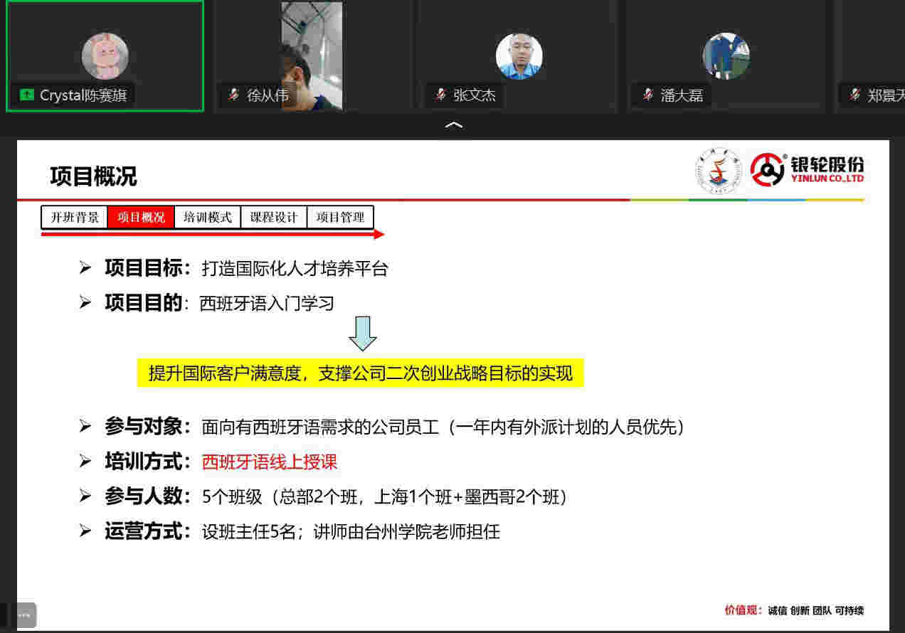 叶春英介绍了台州学院银轮丝路学院成立后,校企双方利用优质资源开展的各项活动,她说,台州学院与银轮股份长期合作,智能制造学院、商学院、人文学院与外国语学院参加丝路学院建设,促进了项目的实施与推进。开设西班牙语培训班,学习西班牙语是银轮股份国际化的需要,希望学员们能够花更短时间掌握到更多学习内容,能够获得更好的成长,展示银轮良好的学习风气,公司会根据教师反馈和学员需求对培训进行迭代升级。