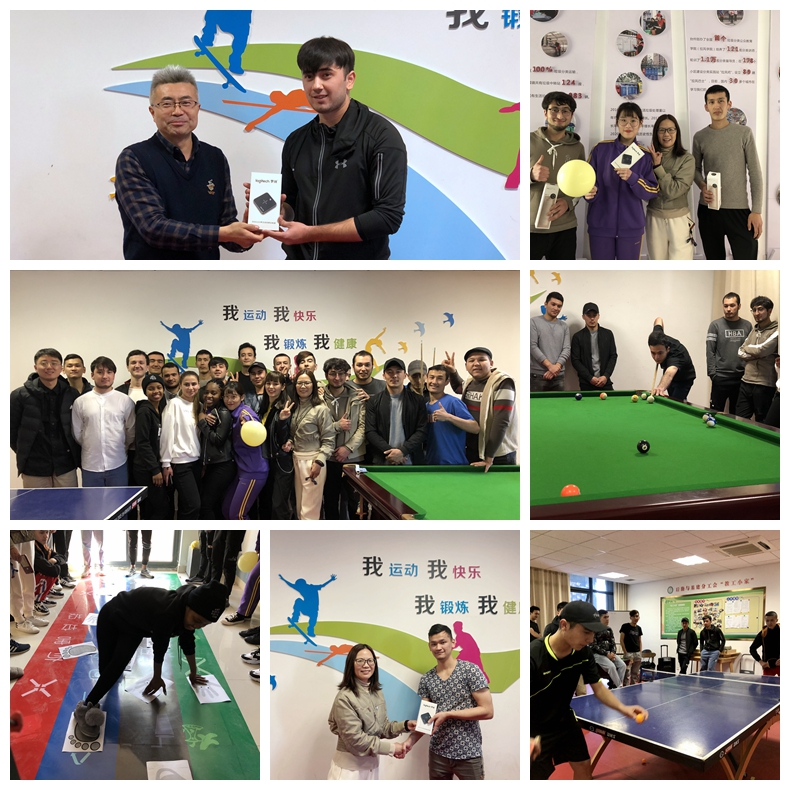 本次趣味运动会共分为三大项目,分别为乒乓球、台球以及三人闯关。乒乓球赛采取3局2胜、11分制,经过一次次比拼淘汰后,来自乌兹别克斯坦的George赢得冠军。比赛结束后,国际学院院长施安全和副院长王爱琴给留学生们上演了一场友谊赛,出色的球技和精彩的防守、绝杀吸引了众多学生围观与喝彩。紧接着是台球分组对抗赛,经过激烈的角逐,Ruzijon脱颖而出,赢得个人赛第一名。同学们对两位冠军的球技称赞不绝口,比赛也激发了他们今后互相学习、切磋球技的热情。