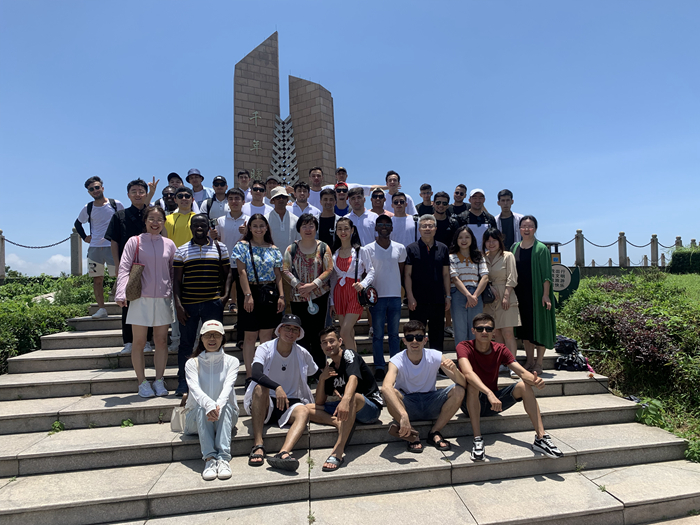 正值小暑时节,骄阳似火,但是国际学生与外教兴致勃勃。首站海利村,依山势而建,沐浴海风,拾级而上,沿途鳞次栉比的民宿建筑、设计巧妙的海洋雕塑,让国际学生与外教纷纷驻足留影。抵达山顶,半悬浮式的对戒观景平台更是让国际学生与外教直呼过瘾,激动的笑声和悦耳的海浪声融为一体,汇成一首奇妙的协凑曲,飘洒在令人心旷神怡的海风里,夏日的炎热一扫而光。来自10多个国家的异国身影成为观景平台上别具一格的美景。