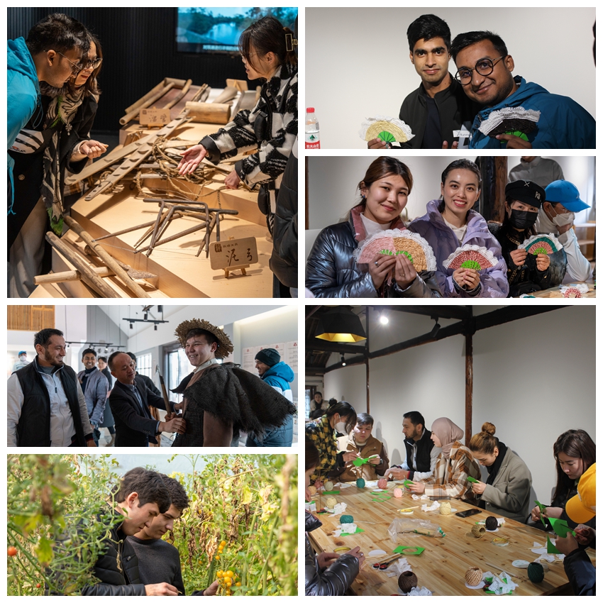 随后,师生一行来到蓬街镇筑塘博物馆和小伍份村红旗粮仓“共富工坊”参观学习。在博物馆中,摆放着扁锹、三角担、溜管、竹帘等筑塘工具,馆内的图片和播放的视频讲述着一代代筑塘人围海造田、保卫家园的励志故事,“艰苦奋斗、顽强拼搏、团结协作、开拓创新”的筑塘精神创造了人类文明新形态,成为了推动路桥经济社会发展的文化精髓,也深深震撼与鼓舞着留学生们。在“共富工坊”,师生一行在镇领导与村书记的带领下,参观了共享大厅、“非遗工作室”以及“孵化舱”,咖啡、户外运动、布贴画、印染、草编等时尚、传统文化元素齐聚于此。据了解,小伍份村乘着美丽乡村建设的东风,围绕“非遗”与传统手工艺,锚定打造路桥区首家“非遗+文创”共富工坊的目标,开始探索“传统文化+创新创业+共同富裕”的全新模式,取得了良好的效果。塔吉克斯坦留学生陈瑞夫说:“没想到中国农村里面还有这么漂亮的地方,我非常想了解更多关于农村的发展故事”。墨西哥留学生芈真说:“让传统文化回归乡村,搭配时尚元素,不仅吸引了村里老人,也迎合了年轻人的口味,这个做法非常好。”行程最后一站,师生们来到蓬街特色农业种植基地考察了小番茄种植情况并做了品尝。