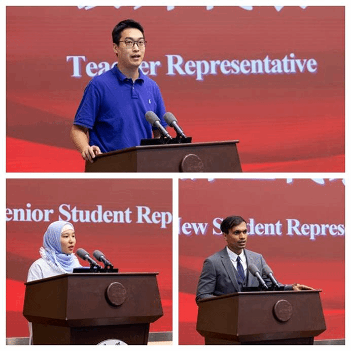 商学院教师沈泓成作为教师代表鼓励学生们在留学期间多了解台州和中国;勇于承担重大责任,为建设“地球村”出力;专注于专业学习,勇敢地探索未来;感谢师长亲友,相信在台州学院的经历将会成为学生们一生中宝贵的财富和难忘的记忆。王美丽与安鹏分别代表全体老生与新生发言,分享了自己在台州学习和生活的感受,表达了对未来的期待和对所有留学生的祝福。