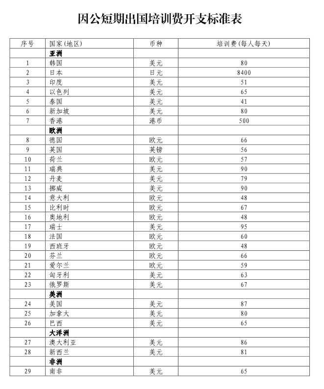 第五条 因公短期出国培训经费应当全部纳入部门因公出国经费预算管理,并按照下列规定执行: