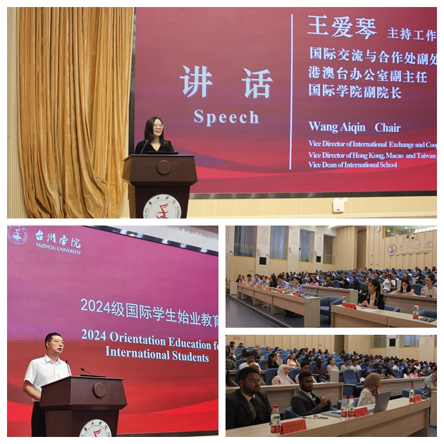 王爱琴代表学校对国际学生的到来表示热烈欢迎,她指出,2024级新生分别来自俄罗斯、孟加拉国、摩洛哥、巴基斯坦、赞比亚、蒙古、越南、卢旺达、苏丹、尼日利亚、伊朗、阿尔及利亚、赤道几内亚、津巴布韦、喀麦隆、利比里亚、乌兹别克斯坦、吉尔吉斯斯坦、塔吉克斯坦等34个国家,这些国家历史上就与中国交流频繁、往来密切。会上,她介绍了作为海港城市台州历史文化与经济特色,台州学院办学成就,并对学生提出六个殷切期望:一是“adaptable”。希望他们尽快融入台州学院的学习生活氛围,遵守中国法律法规和校纪校规,成为学校的一份子。二是“integrity”。诚信是学生的品德追求,希望他们诚信为人处事,在学习上确定目标、激发兴趣、增长知识、掌握技能,做一个有计划的人。三是“aim-oriented”。希望他们能够在知识的海洋中确定目标、激发兴趣、增长知识、掌握技能,做一个有计划的人。四是“team-focused”。希望他们在生活上互帮互助,在学习上共同进步,在团队合作中提升自我。五是“hardworking”。希望他们勤奋学习,追求学识与能力上的突破,努力成长为高素质、专业化的国际化人才。六是“available”。希望他们学好汉语,学好专业知识,成为促进国家之间交流的友好“使者”,才能成为中外文明互学互鉴的“桥梁”。