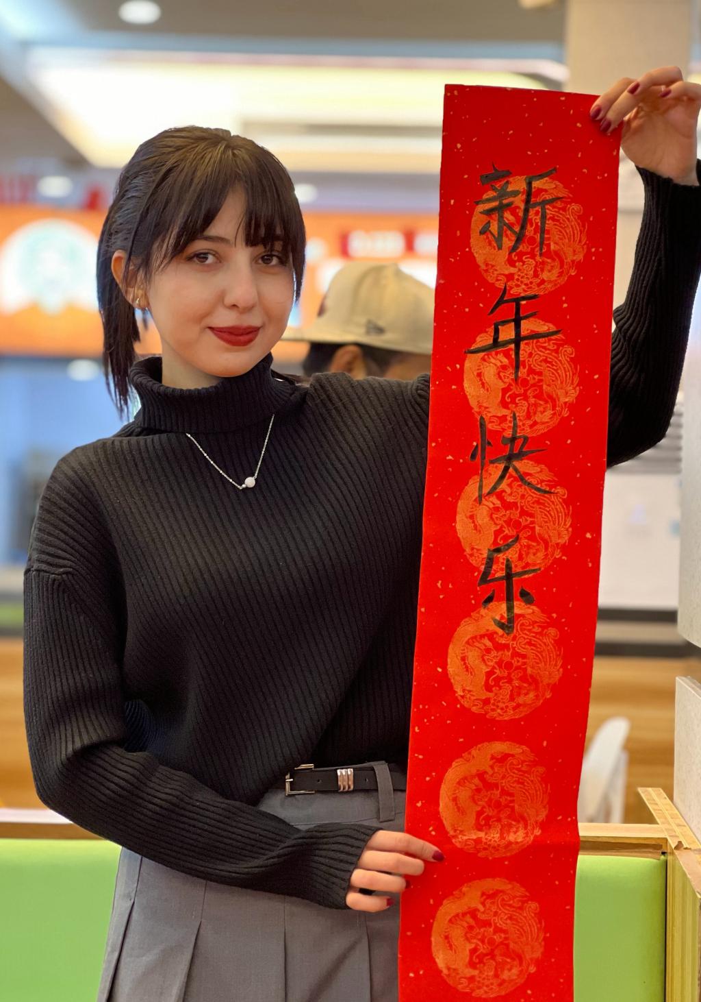 游戏环节结束后,大家品尝着热气腾腾的饺子,感受着中国传统美食带来的温暖。与此同时,写春联、写福字活动也同步进行。现场准备好笔墨红纸,国际学生们纷纷跃跃欲试,虽没有书法老师指导,但大家凭借着对中国文化的热爱与好奇,大胆发挥。有的学生认真回忆着平日里看到的春联字体,一笔一划地临摹;有的则发挥创意,将自己对新年的祝福融入独特的书写风格中。大家互相展示作品,交流心得,浓浓的年味在互动中愈发浓郁。