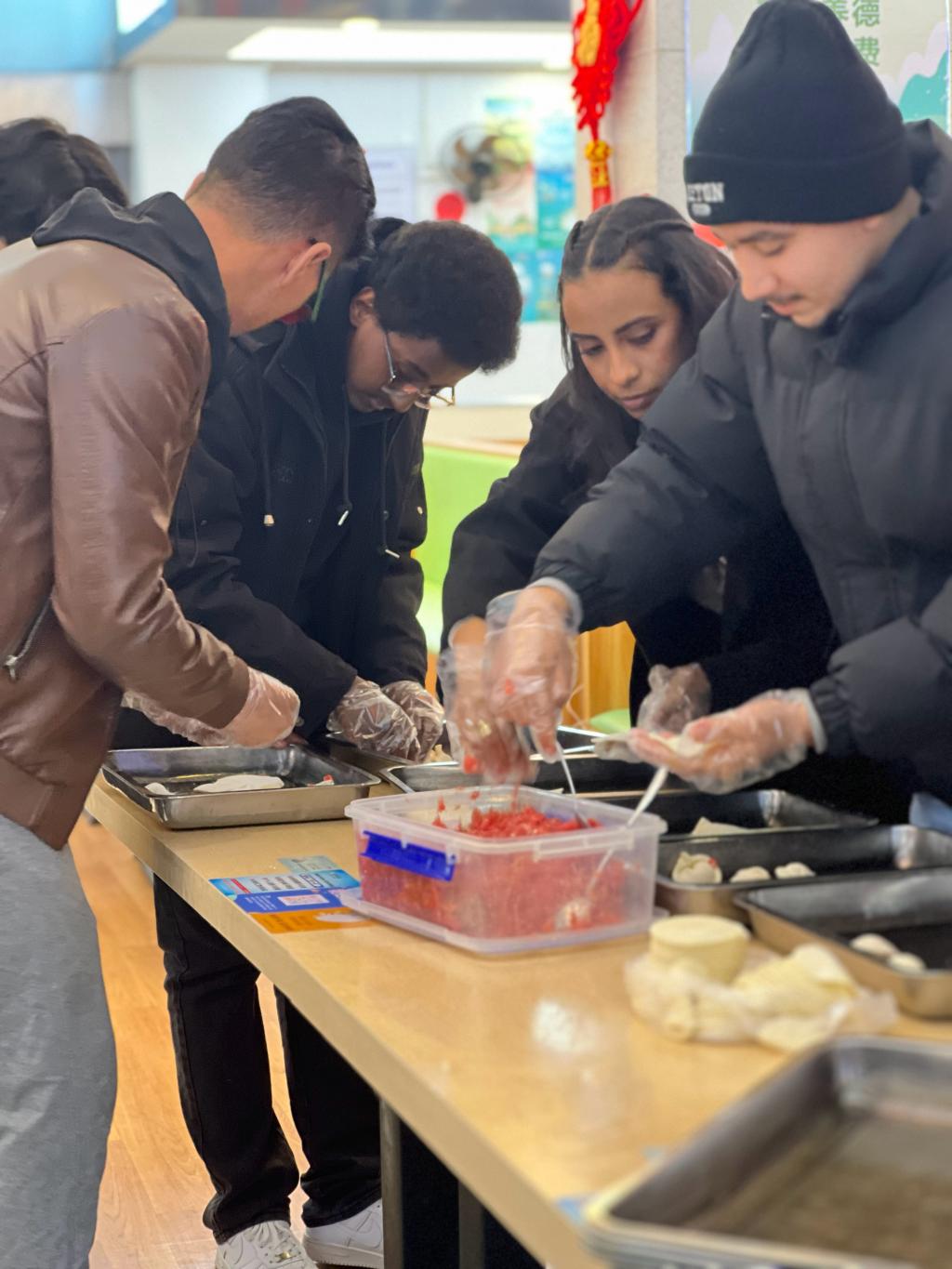 来到游戏环节,现场气氛更加热烈。筷子夹弹珠游戏考验着大家的手眼协调能力,选手们全神贯注,小心翼翼地用筷子夹起弹珠,一旁的观众则在为他们加油助威,呐喊声此起彼伏。包饺子大赛别开生面,重点比拼饺子的美观程度。国际师生们充分发挥创意,包出的饺子造型各异、精巧美观,现场满是欢声笑语。经过评委从形状、整体美感等多方面评选,优秀作品脱颖而出,赢得阵阵赞叹。吃饺子比赛更是将欢乐氛围推向高潮。选手们围成一桌,随着一声令下,迅速开动。大家大快朵颐,现场洋溢着欢乐与满足。观众们也被这热烈的场景感染,加油声、欢笑声交织在一起。
