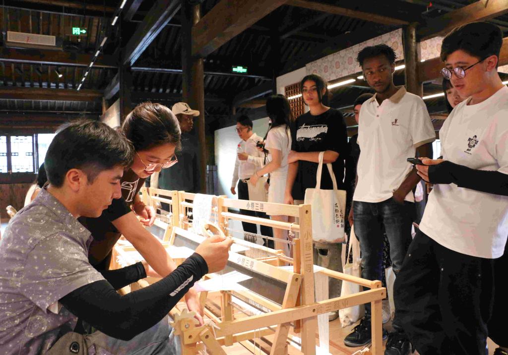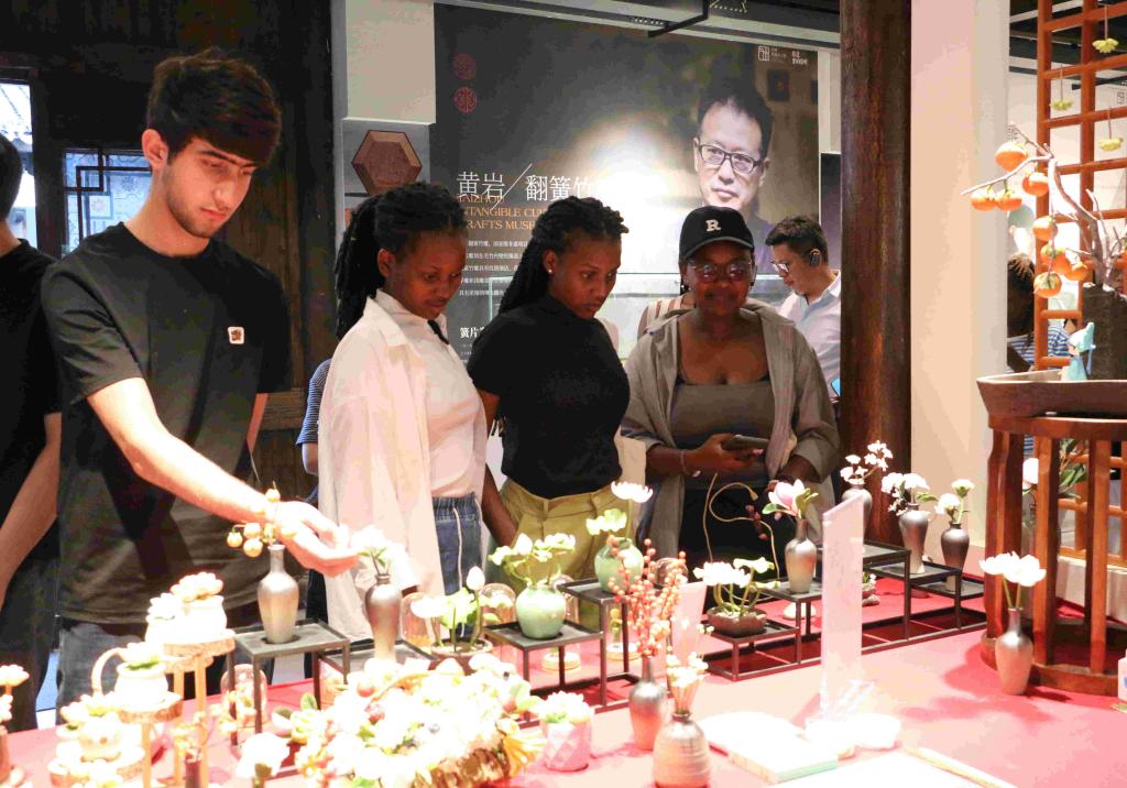 演出结束后,留学生们走进非遗百工馆参观。馆内丰富多样的非遗展品,巧夺天工的灰雕,精妙绝伦的油纸伞,独具韵味的蓝花布印染等,让留学生们目不暇接,不时发出阵阵惊叹。他们认真聆听讲解,仔细观察每一件展品,不时提出问题,对台州的非遗文化表现出浓厚兴趣。