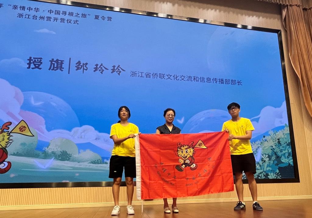 浙江省侨联文化交流和信息传播部部长邹玲玲为台州营授旗,红色营旗飘扬,象征着文化传承的使命正式开启。