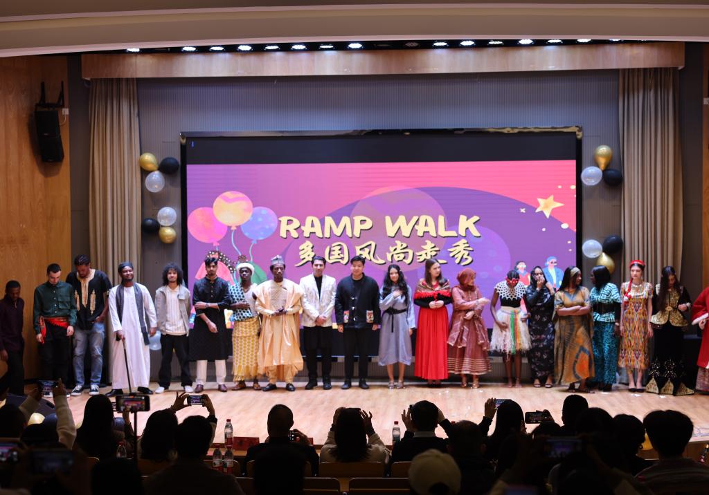 伴随着一段展现校园风光与学院特色的欢迎视频,晚会正式拉开帷幕。“环游世界”各国风采走秀率先登场,来自俄罗斯、巴基斯坦、苏丹、尼日利亚等17个国家的学生身着各具特色的传统与现代服饰,自信迈步走上舞台,将不同国家的文化风情展现得淋漓尽致,台下掌声与欢呼声此起彼伏,瞬间点燃现场氛围。