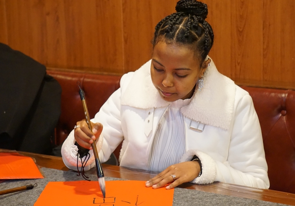 伴随着悠扬欢快的中国传统民乐,国际学生陆续签到入场,纷纷驻足书法体验区。他们手持毛笔,认真临摹春联与“福”字,一笔一划间,不仅感受着汉字的独特韵味,更将对新春的美好期许融入笔墨之中。